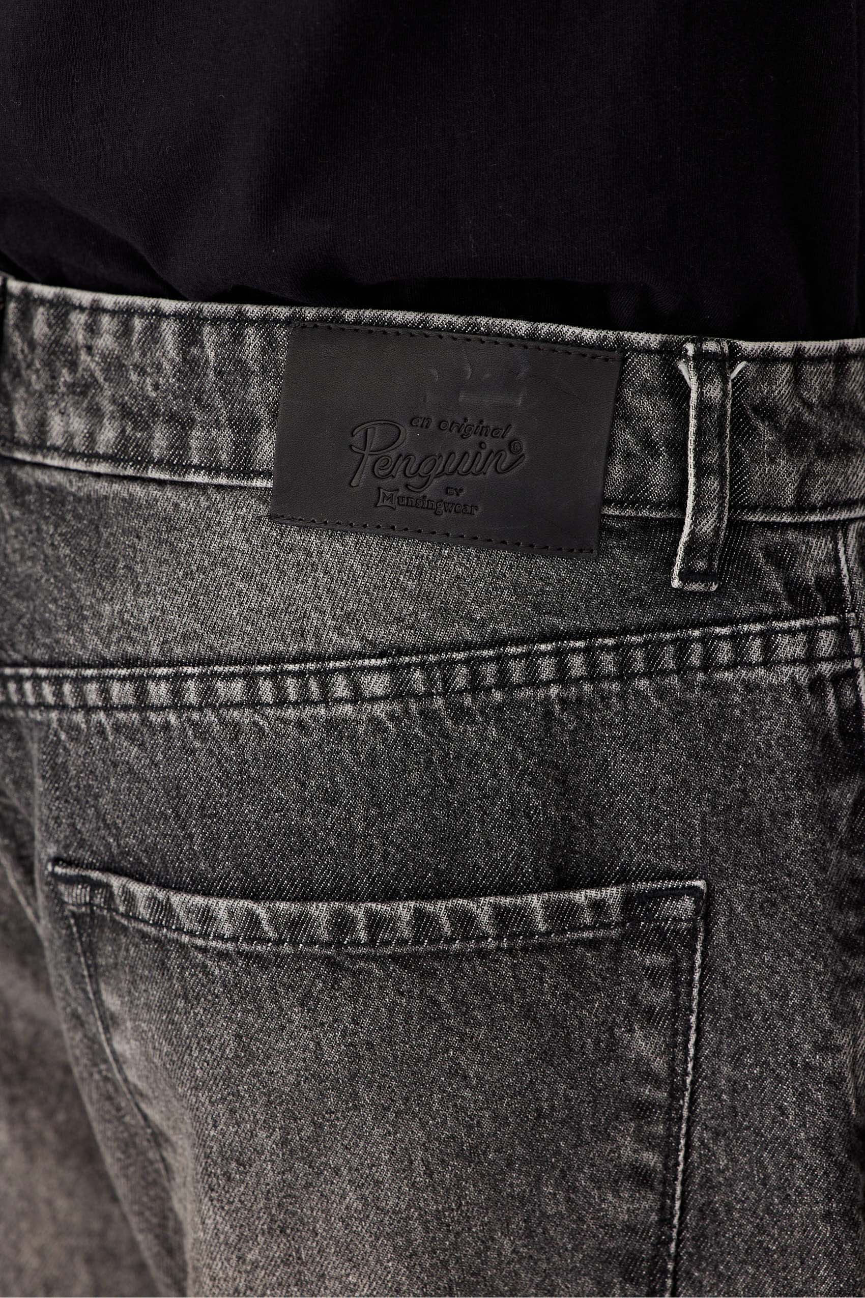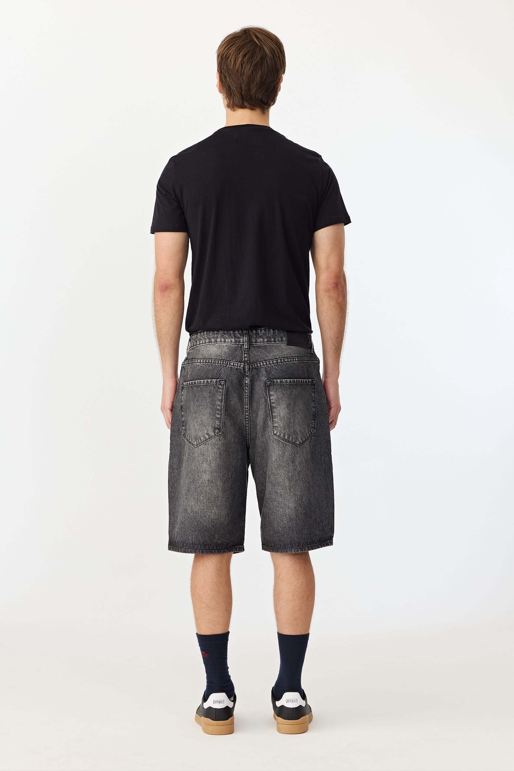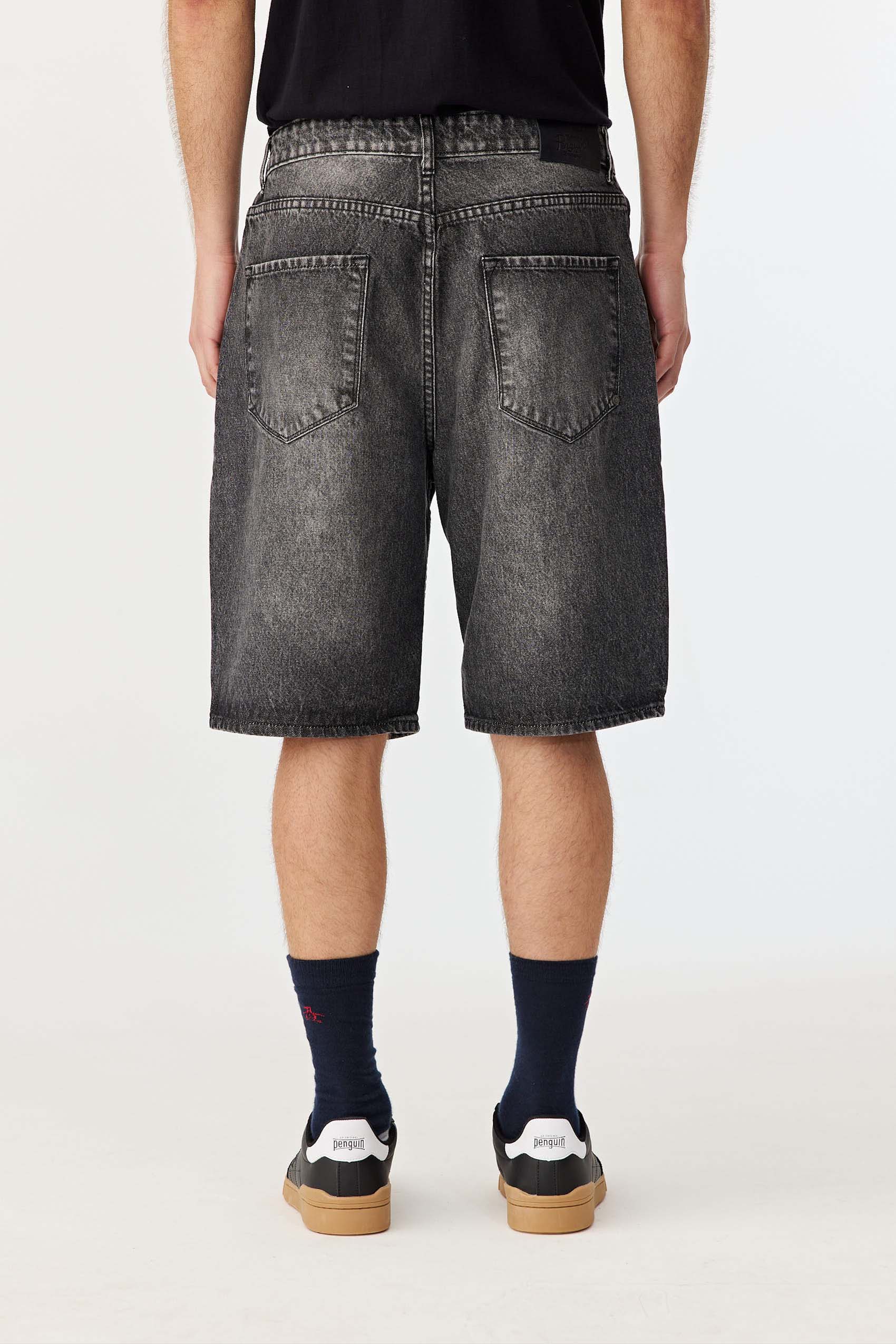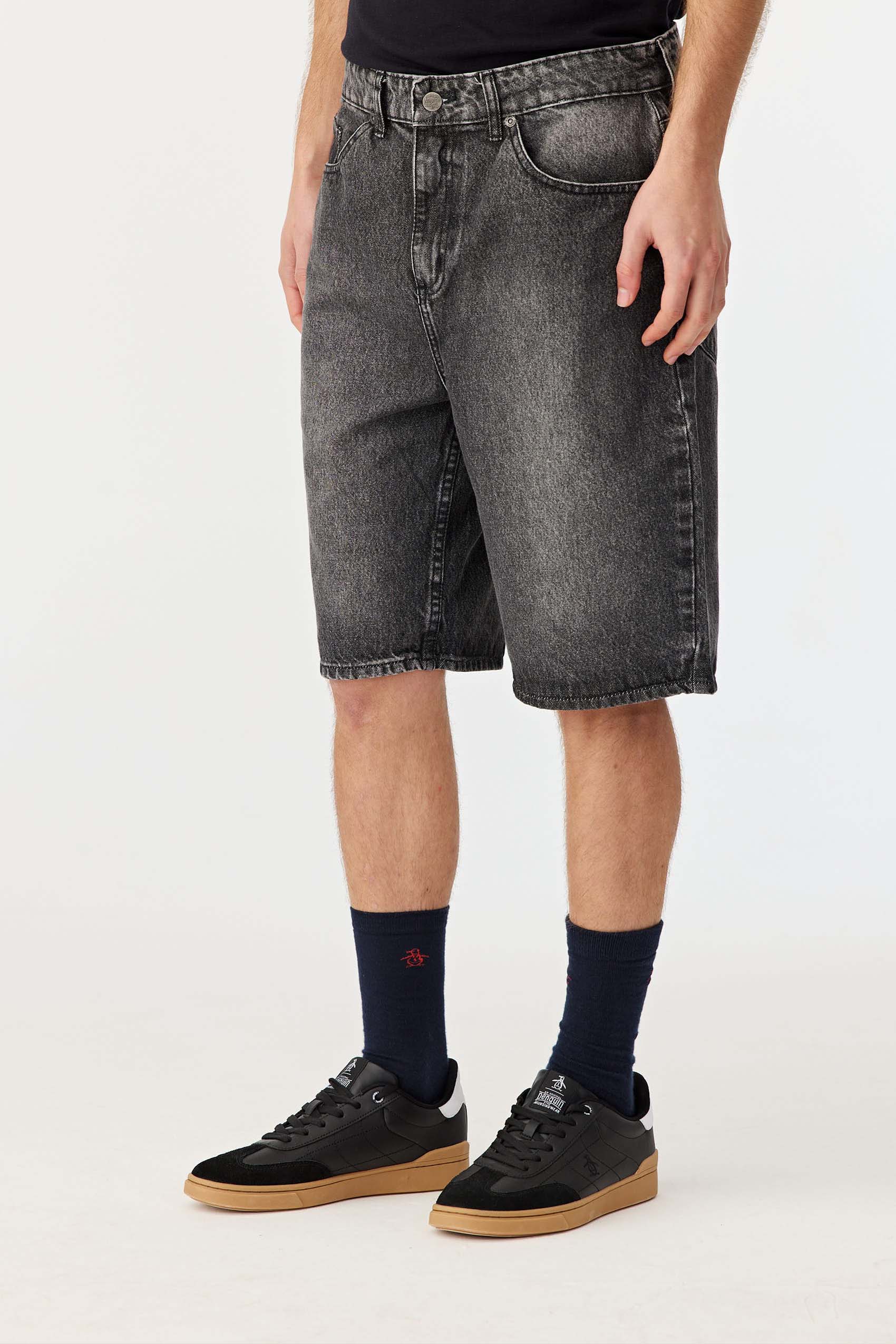 Bermuda de 5 bolsillos realizada en denim negro con desgaste a gris. Con cierre y botón en cintura. Remaches metálicos en extremos de bolsillos. En trasero tiene un cuero con logo marcario. Calce superior suelto en cadera, muslos y piernas rectas hasta debajo de rodilla. Relaxed fit.