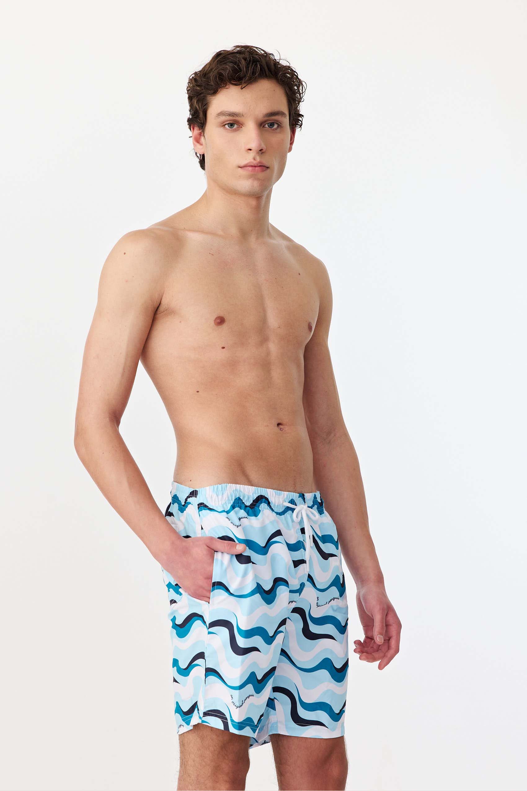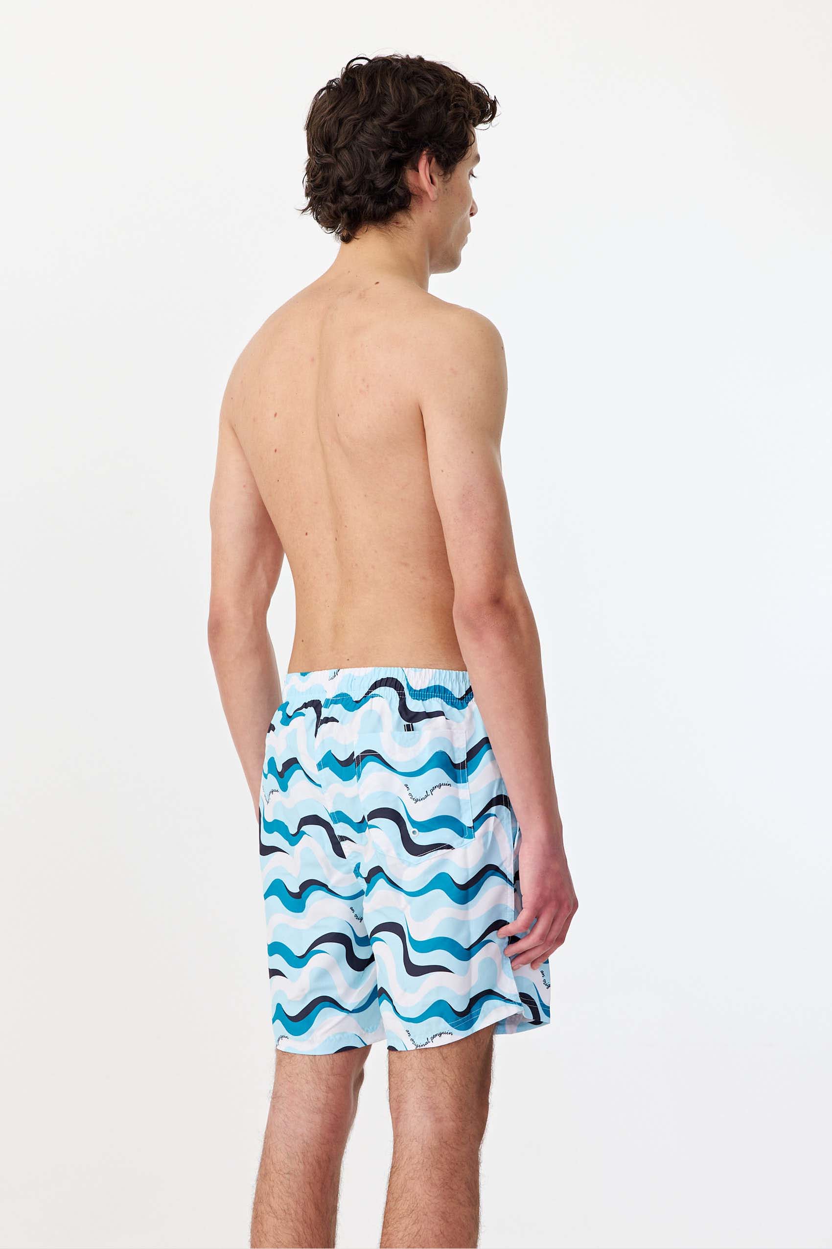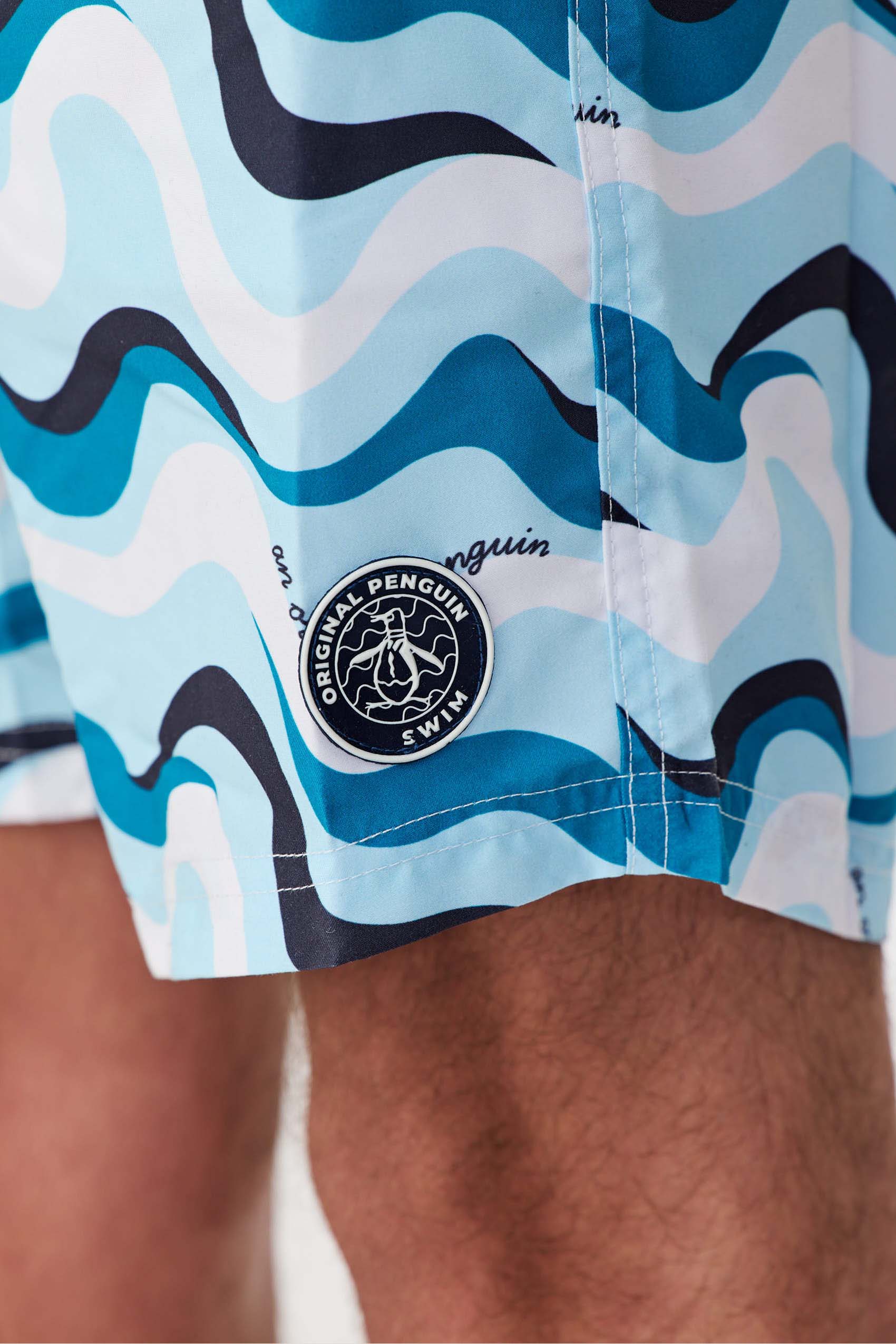 Short de baño sublimado dibujo de temporada, con cintura elastizada con cordón a contratono con punteras, para regular calce. Logo parche de goma con pingüino aplicado sobre ruedo de pierna izquierda lateral. Bolsillos laterales y bolsillo trasero. Suspensor de mesh blanco. Volley fit, medio.