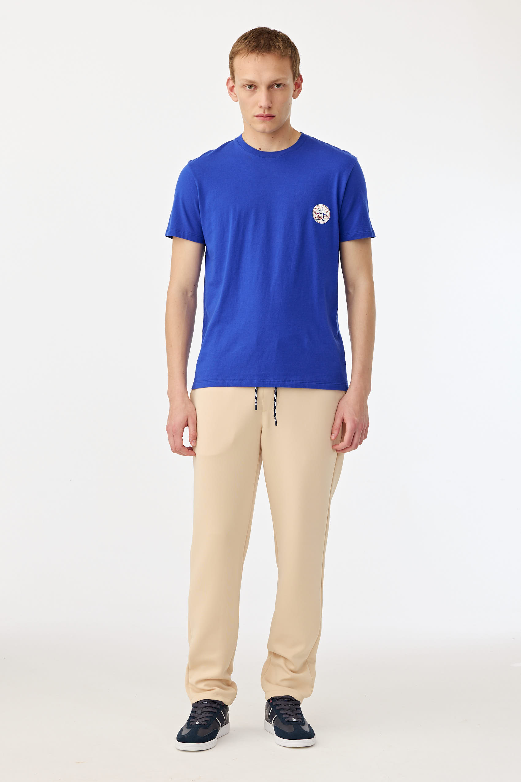 Remera de cuello redondo, realizada en jersey liso. Cuello de rib al tono. Estampa lateral logo retro de marca a contratono. Grifa Pingüino en ruedo manga izquierda.